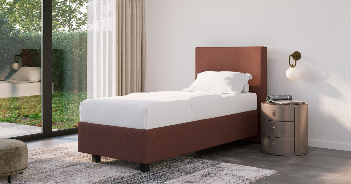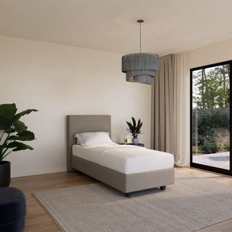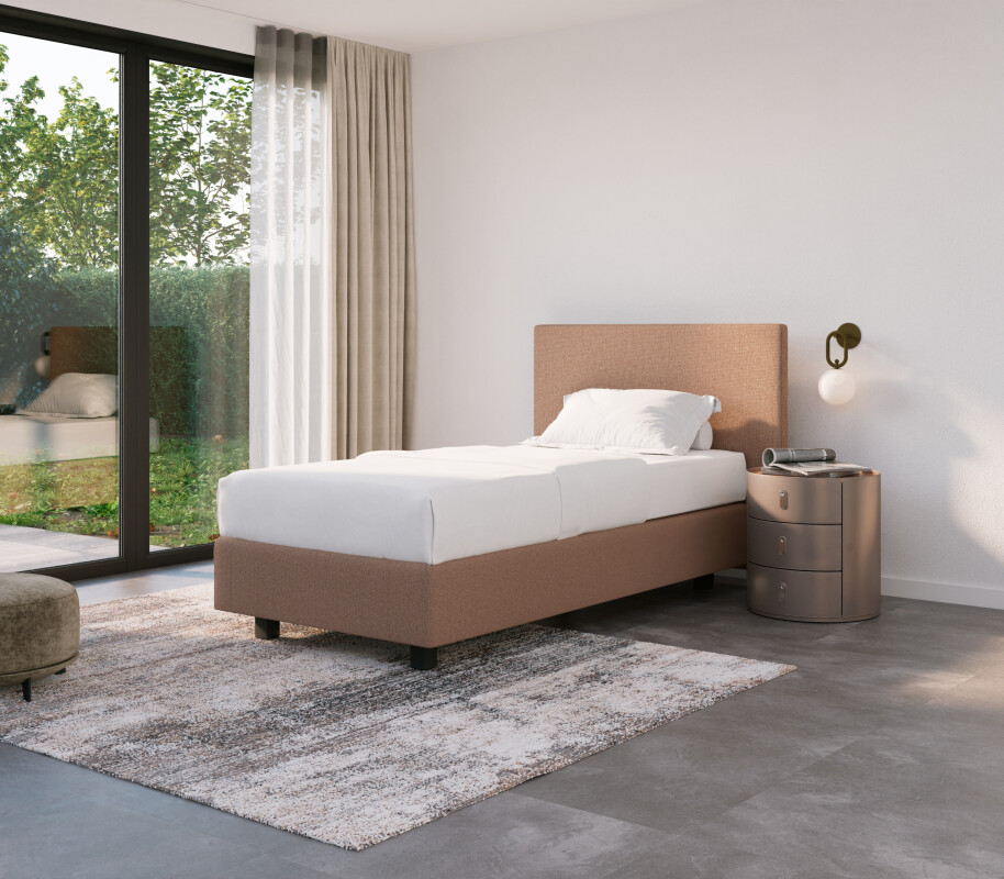 De Boxspring terra vlak onderscheidt zich door zijn schuin aflopende hoofdbord, afgewerkt met een decoratieve bies:
